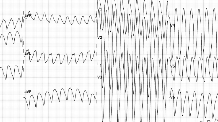 Deux électrodes sont appliquées sur la poitrine et relié à un défibrillateur externe. Le choc électrique permet le plus souvent de rétablir un rythme cardiaque régulier mais celui-ci doit le plus souvent être maintenu par un traitement médicamenteux ou une ablation par radiofréquence.